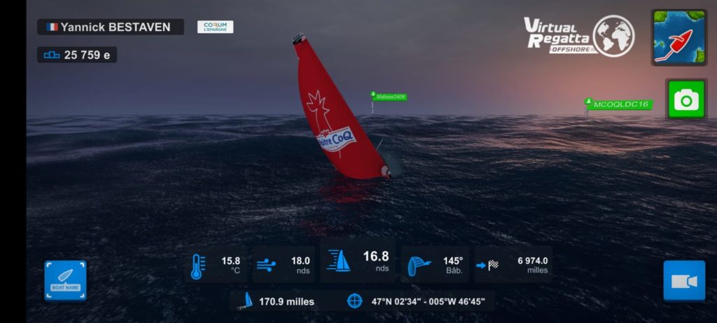 La première étape, le Vendée Globe Atlantic eSeries a démarré hier avec près de 35000 inscrits. Lucas est aux manettes et en fin stratège a optionné dès le départ en n’hésitant pas à tirer un long bord vers le large afin de se positionner pour une descente tout schuss vers le Cap Finistère