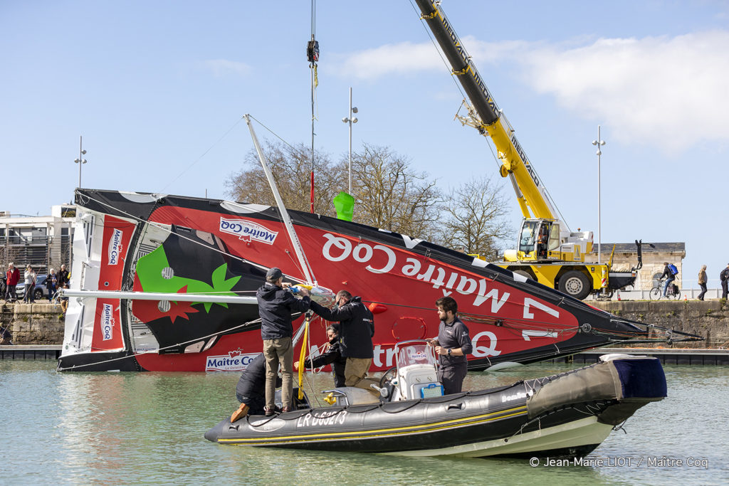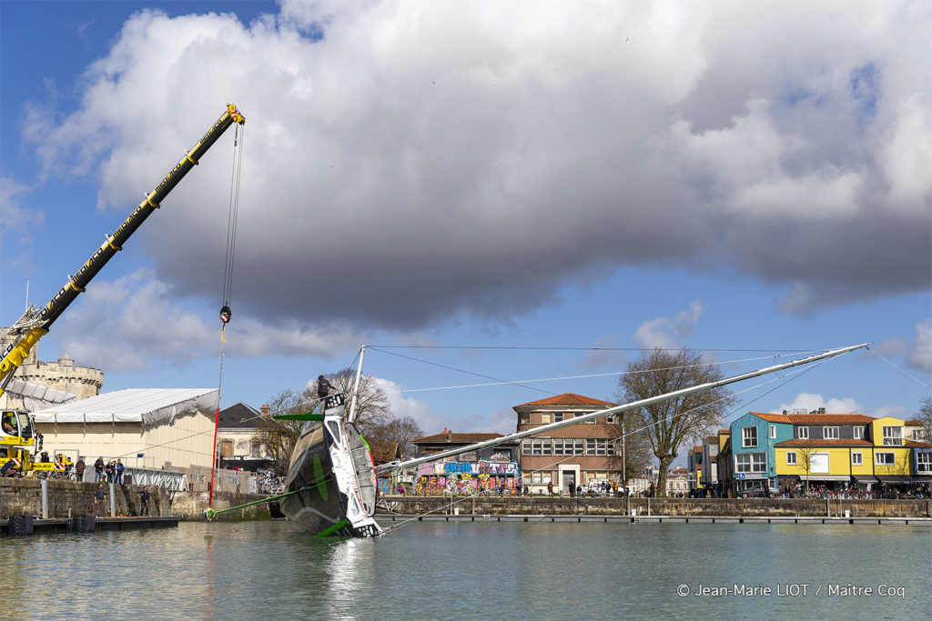 Ensuite, selon le choix des équipes, ou l’on tire sur le mât ou l’on tire sur la quille pour coucher le bateau délicatement à l’horizontal. « C’est toujours un peu stressant car il y a de nombreuses forces en jeu » témoigne Yannick Bestaven.