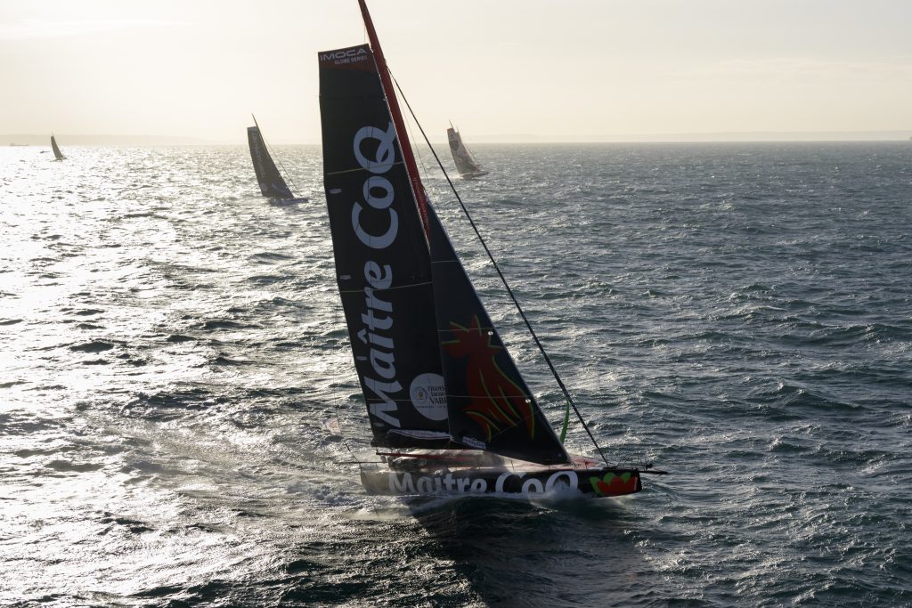 Yannick Bestaven et Julien Pulvé à bord de Maître CoQ V se sont élancés parfaitement, dans les premiers sur la ligne, prêts à en découdre sur les 3765 milles du nouveau parcours qui les conduira tout droit en Martinique avec, comme passage imposé, l’île de Santa Maria (Açores) à laisser à tribord.