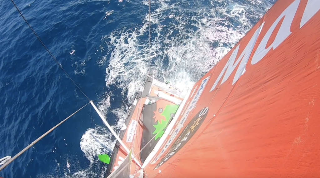 C’est avec de doux « bips bips » indiquant que des messages arrivaient sur le groupe whatsapp entre le team et le bateau, que nombre d’entre nous avons commencé notre journée. Derrière nos téléphones à plus de 15 000 milles à vol d’oiseau, Yannick nous criait, nous hurlait sa joie d’être enfin parvenu à grimper en haut de son mât et d’avoir effectué la réparation de sa voile d’avant tout terrain, le J2, qui souffrait d’un accroc depuis une semaine. En cause un départ à l’abattée qui avait couché le bateau sur l’eau. Le skipper Maître CoQ privé de sa voile fétiche, s’en trouvait un peu handicapé…