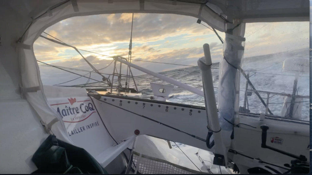 J’ai eu des bonnes conditions pour aller vite, mais très fraîches. Là, la température de l’eau est remontée un peu, à 6°C, mais hier, elle était à 3°C. C’était dur, il faisait gris, froid, j’avais les pieds dans des bottes gelées, mais c’est vrai que j’ai bien avancé. Là, le vent commence à mollir, ça devient un souci car j’ai l’impression que ça va tamponner, c’est pour ça que je pense que les bateaux de derrière vont revenir. Du coup, ce matin, j’ai manœuvré, j’ai envoyé des voiles plus grandes pour contenir les assauts de mes poursuivants, j’essaie de trouver la bonne voile pour continuer à avancer.