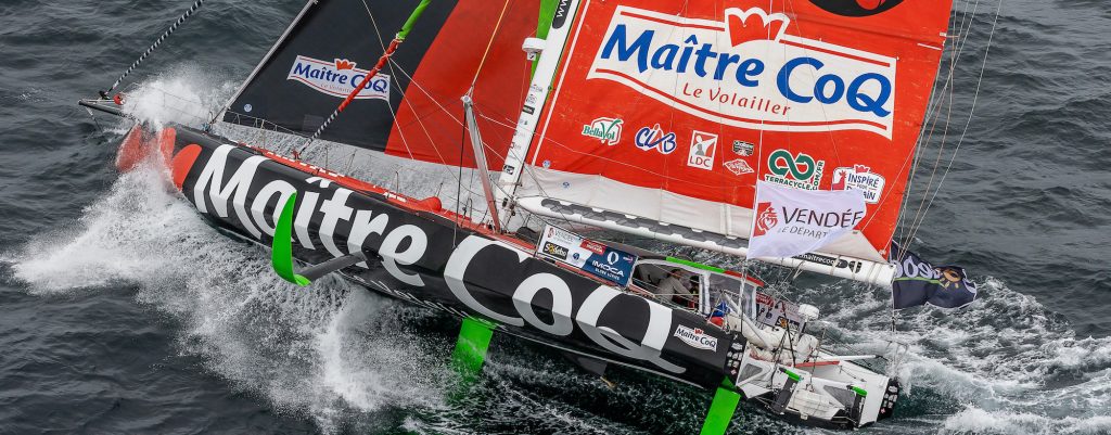 Maître CoQ IV cavale à 15 nœuds dans un mer formée avec deux ris dans sa grand-voile et le J3 à poste ( ndlr : voile d’avant appelée aussi trinquette que l’on arbore quand le vente oscille entre 18 et 35 nœuds). Devant lui quelques heures encore tendues avec le passage du front à négocier.