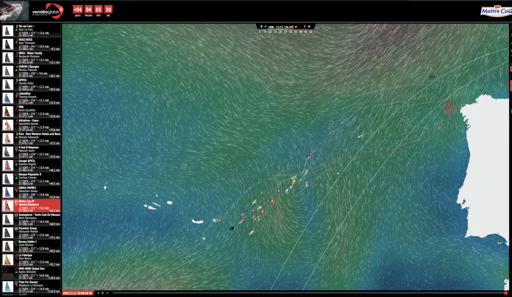 En particulier le choix entre une route à l’ouest pour aller chercher une bascule de vent au nord derrière le premier gros front du Vendée Globe, et une trajectoire plus sud, à l’intérieur du DST du Cap Finisterre (dispositif de séparation du trafic, interdit à la navigation), plus sage. C’est finalement pour cette dernière qu’a opté Yannick, comme  l’explique Jean-Marie Dauris,  directeur technique et sportif du Team Maître CoQ. « La route est longue, Yannick a clairement préféré jouer la sécurité et éviter d’aller au carton dans des conditions difficiles de mer. Au final, ça s’est avéré être une bonne route, parce qu’il y a peu d’écarts entre les bateaux qui se sont tous regroupés dans la même zone au final. »
